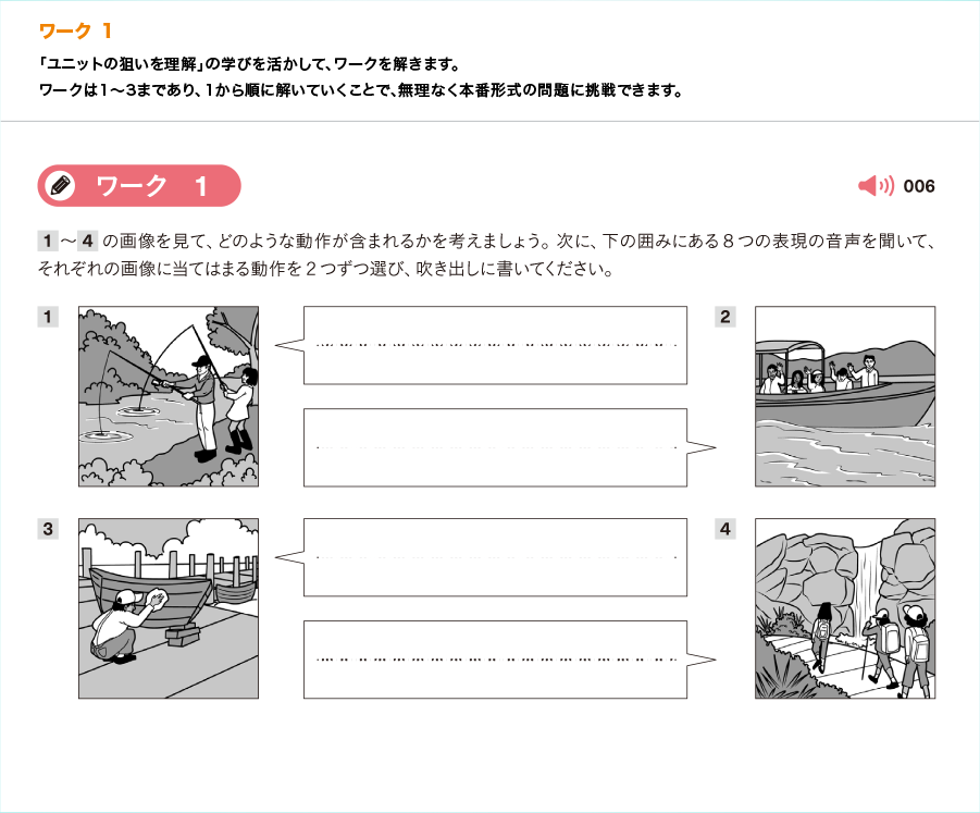 解答を書き込めるワークブック形式で、パートごとの問題タイプ別に全16ユニットで構成。1ユニットごとに、学習ポイントでユニットの学習テーマの要点を確認し、3種類のワークで解き方の流れのコツを押さえた後、ミニテストを解くことにより、知識を定着させ、同じタイプの問題に対応できる力をつけます。